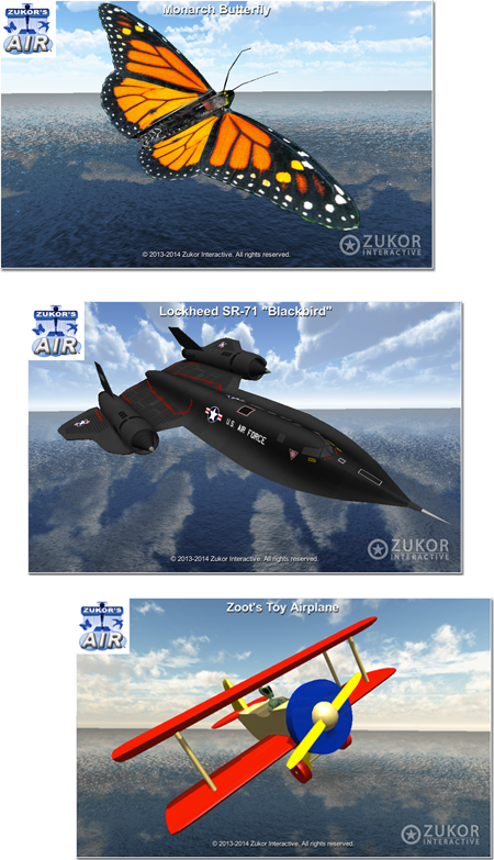 Zukor's Air ist ein Feedback-Spiel mit einer Flugumgebung und hochqualitativen Flugzeugen, Tieren und Fantasiewesen. Es wurde für eine breite Spanne von Personen konzipiert, einschließlich Männer, Frauen, Jungen, Mädchen und Kinder jeden Alters.
