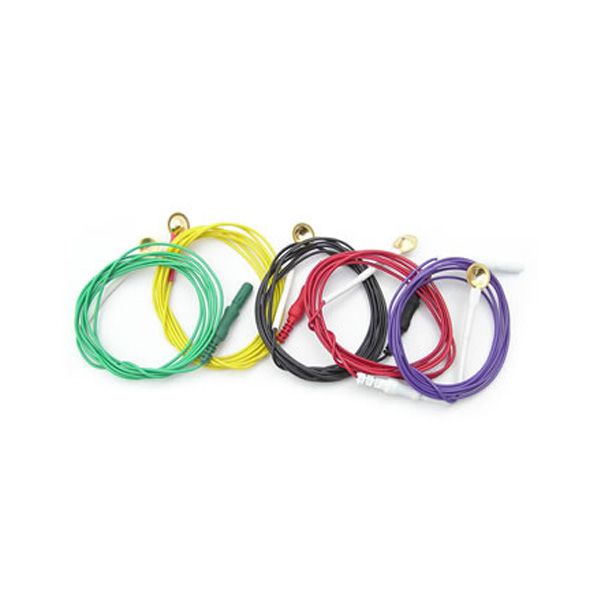 DIN Style, 9 mm gold cup electrodes with built-in lead wires. Comes with 18-inch lead wires. Sold in singles or sets of 5; one each: blue, yellow, black, green, red. Can be applied with 10-20 paste, or inserted into FlexTrodes.